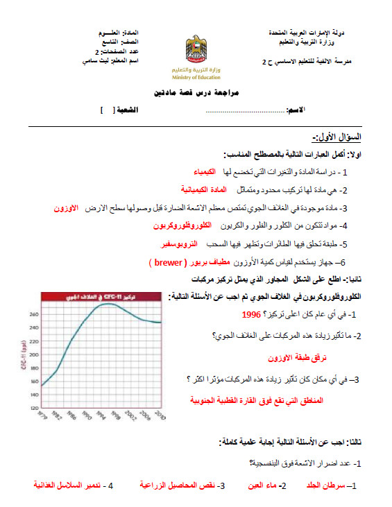 مراجعة لدرس قصة مادتين مع الاجابة الصف التاسع العام علوم الفصل الأول المناهج الإماراتية